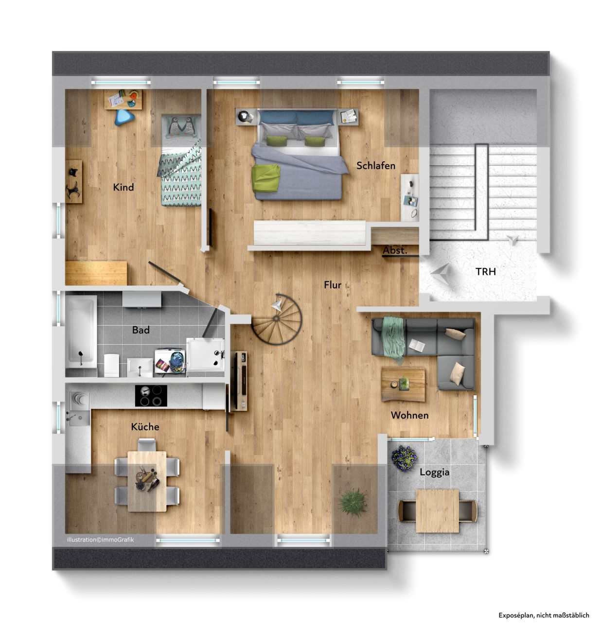 Das Herzstück der Immobilie bildet der großzügige Wohn-/ und Essbereich mit direktem Zugang zur Loggia; ein idealer Platz für entspannte Stunden. Die zwei gut geschnittenen Schlafzimmer bieten vielseitige Nutzungsmöglichkeiten, sei es als klassisches Schlafzimmer, Homeoffice oder Kinderzimmer. Die separate Küche ist mit einer Einbauküche ausgestattet und ermöglicht einen sofortigen Einzug bzw. eine unkomplizierte Vermietung. Das Tageslichtbad überzeugt mit Dusche, Badewanne, Waschmaschinenanschluss sowie angenehmer Fußbodenheizung. Das Bad und die Küche sind mit Fliesen, in zeitloser Optik, versehen; die Wohn-/ und Schlafräume sind mit Parkettboden ausgestattet. Ein Glasfaseranschluss garantiert zudem eine zukunftssichere und schnelle Internetanbindung.