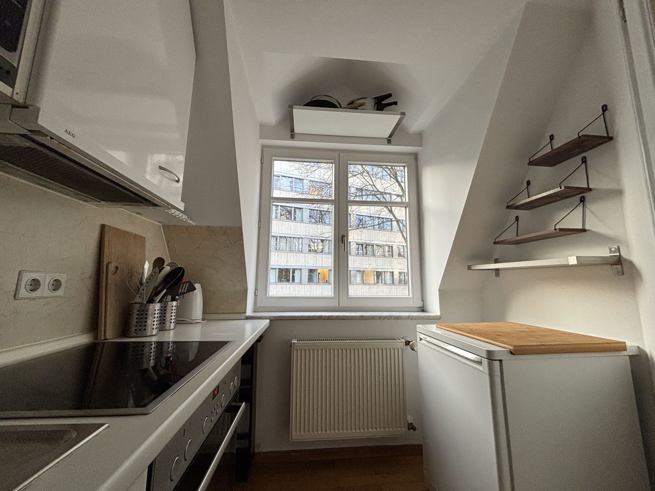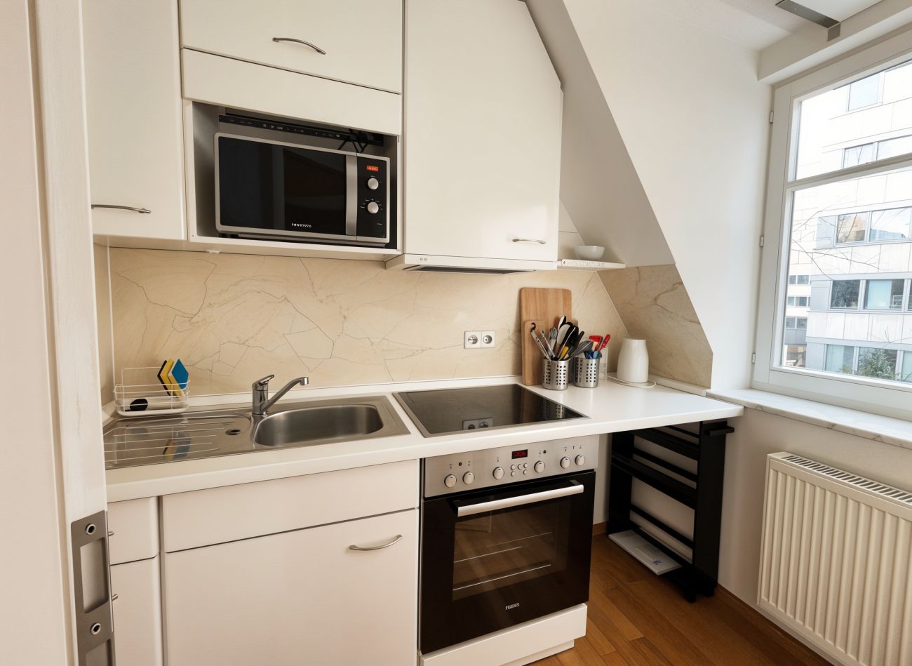 Beschreibung Dieses kleine – aber feine – 1-Zimmer-Appartement befindet sich im zweiten Obergeschoss der "Villa Kustermann" im Kustermannpark in München, ganz nahe dem Werksviertel am Ostbahnhof. Die ca. 31 m² Wohnfläche verteilen sich auf einen schönen und geräumigen Wohn-/ und Schlafbereich, das helle und freundlich Bad mit Fenster, die Küche – ebenfalls mit Fenster und einen kleinen Flur. Der Wohnraum, die Küche und der Flur sind mit hochwertigem Parkett ausgestattet. Das Bad ist zeitlos weiß gefliest und verfügt über eine große Wanne mit Duschfunktion. Die Wohnung wird komplett möbliert vermietet, d. h. sämtliche Einrichtungsgegenstände wie auch die Küche gehören zu diesem Appartement - Koffer auspacken und fertig!!! Im Kellergeschoss des Hauses steht Ihnen noch ein geräumiges Lagerabteil zur Verfügung. Auch ein Tiefgaragen-Einzelstellplatz gehört zu dieser Wohnung und ist im Mietpreis bereits enthalten. Der Bezug dieses schönen Appartements kann ab sofort, jedoch bitte ohne Haustiere, erfolgen. Der Energieausweis ist in Bearbeitung!