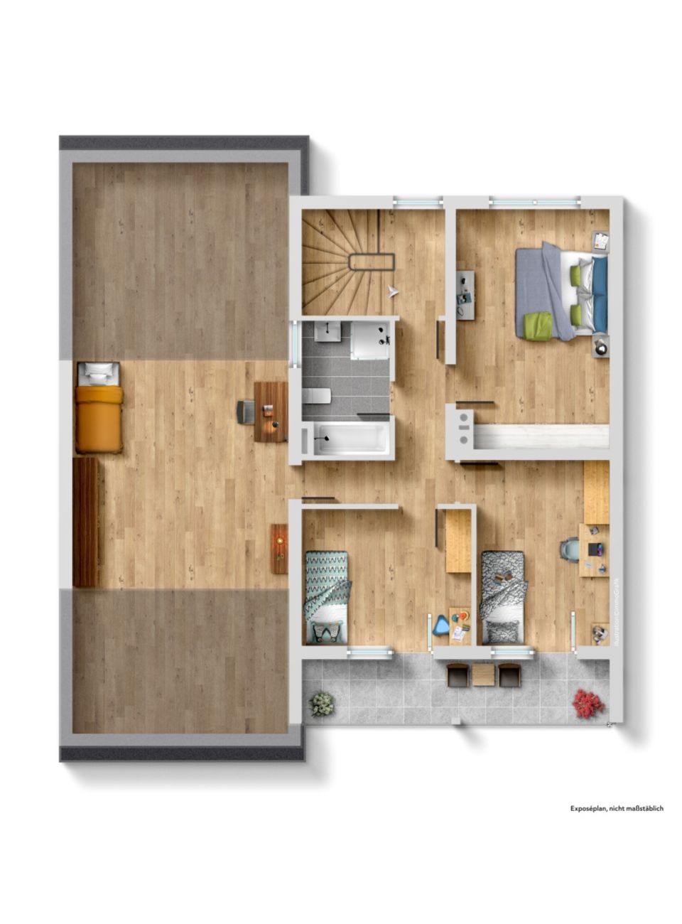 Im Obergeschoss mit ca. 70 m² Wohnfläche finden Sie die drei komfortable Schlafzimmer, den riesigen ausgebauten Raum über der Garage, das helle Bad mit Wanne und Dusche sowie den überdachten Balkon mit weitem Blick über die Felder ins Grüne.