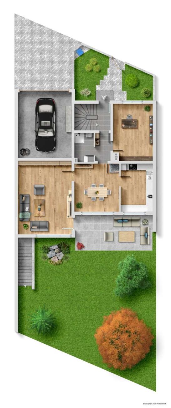Das Erdgeschoss mit ca. 110 m² Wohnfläche hat eine fast 13 m² große Wohnküche, ein über 16 m² großes Esszimmer sowie das fast 28 m² große Wohnzimmer, das behindertengerechte Bad mit ebenerdiger Dusche sowie den beheizbaren, ganzjährig bewohnbaren Wintergarten. Ein Schlafzimmer rundet diese Etage ab.