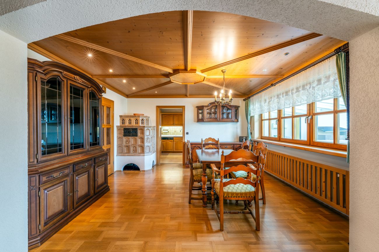 Die Fenster sind noch die ursprünglichen braunen Holzfenster, die Türen sind hochwertige Vollholztüren, die Decken im Erdgeschoss geschmackvoll vertäfelt. Die grosse Einbauküche mit allen Großgeräten ist im Preis inbegriffen, ebenso die Doppelgarage mit Elektroantrieb.